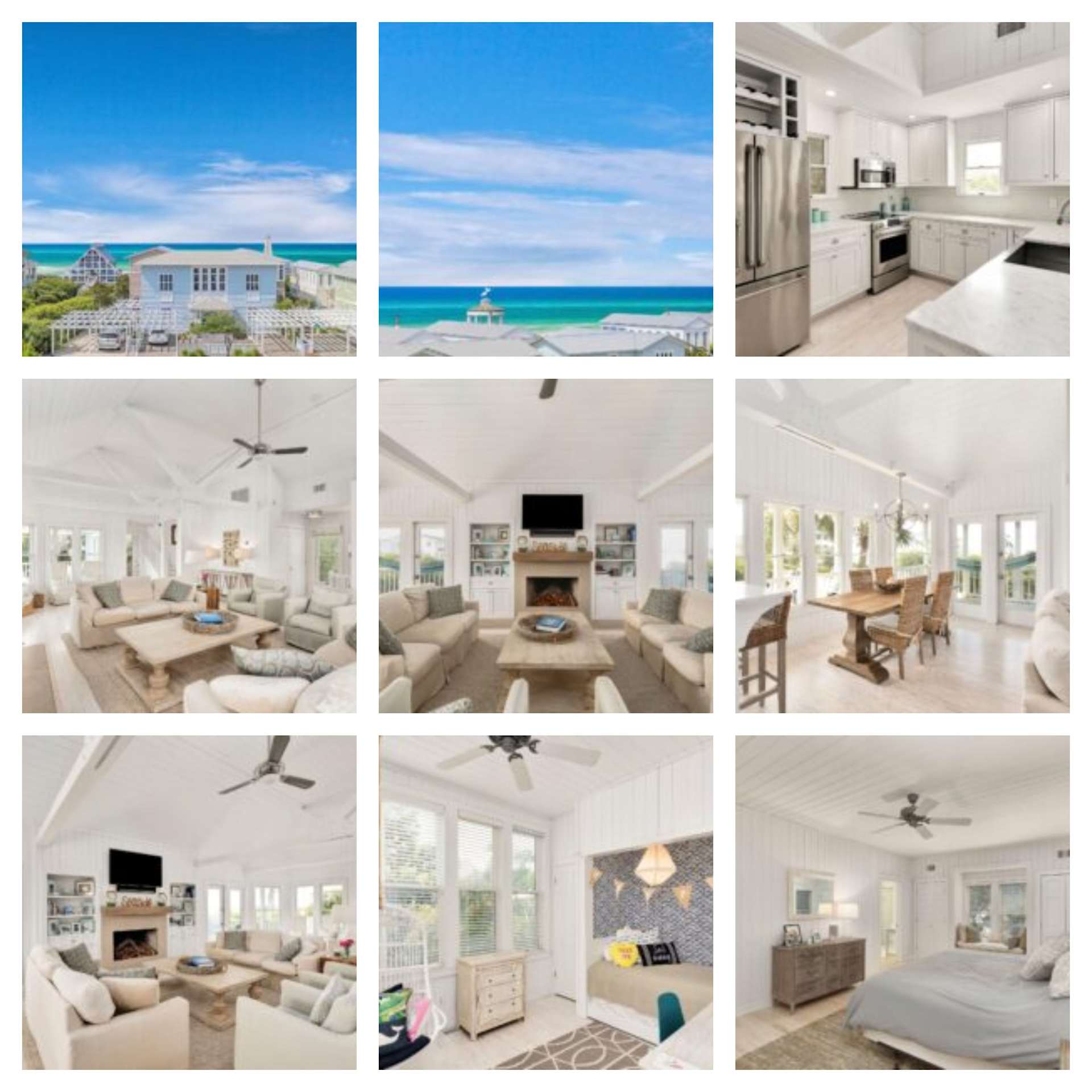 Coastal Charm awaits at this 4 bedroom, 4 bath, 2,774 square foot Seaside beach cottage located directly on 30A and the corner of West Ruskin Street. Just one block from the Seaside town center and across the street from one of Seaside’s nine private beach accesses. This home offers wood flooring and ceiling with white shiplap walls throughout and an abundance of porch space on each level allowing you to take advantage of Florida beach living. This beach abode has a reverse floor plan with the main living area on the second floor allowing you to enjoy views of the Gulf of Mexico better. The first floor offers the master bedroom and master bath along with 2 additional bedrooms, each with their own ensuite. The second floor boasts a soaring vaulted white shiplap ceiling accented with beautiful white wood beams and a large wrap-around porch.